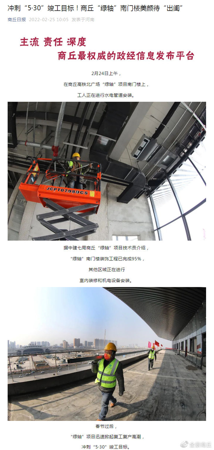 2022年02月,商丘高铁北广场“绿轴”项目南门楼正在进行水电管道安装。“绿轴”南门楼装饰工程已完成95%,其他区域正在进行室内装修和机电设备安装,冲刺“5·30”竣工目标。