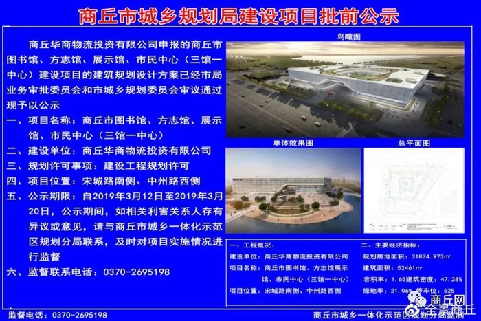 2019年03月,商丘“三馆一中心”项目进行批前公示。