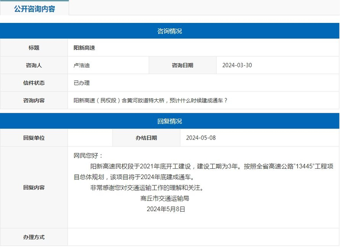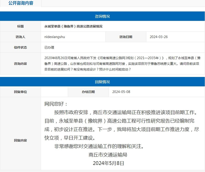 网民您好:按照市政府安排,商丘市交通运输局正在积极推进该项目前期工作。目前,永城至单县(豫鲁界)高速公路工程可行性研究报告已经编制完成,初步设计正在推进。下一步,我局将加大项目前期工作推进力度,尽快立项,早日开工建设。非常感谢您对交通运输工作的理解和关注。