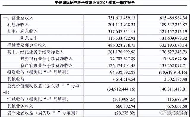 2025年一季度,中银证券业绩亮眼,营业收入7.52亿元,净利润2.8亿元,同比分别增长22.12%、38.6%。其中,利息净收入同比增长3.93%,手续费及佣金净收入同比增长46.31%,投资收益由亏转盈。