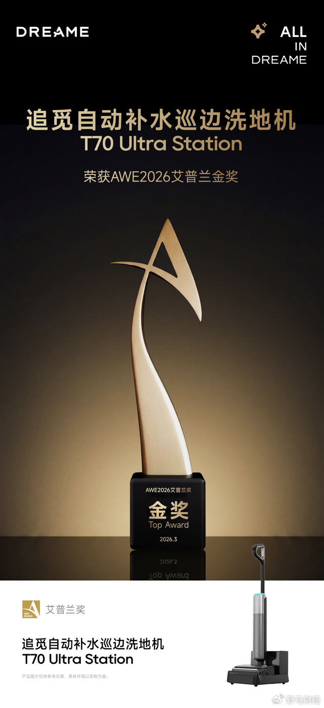 从货架电商到兴趣电商,追觅洗地机在不同流量场域都拿到了头部位置,这与其说是某个渠道运营的胜利,不如说是一种产品势能的自然外溢。同期,T70 Ultra Station还拿下AWE 2026最高荣誉——艾普兰金奖,实现市场口碑与权威奖项双丰收。