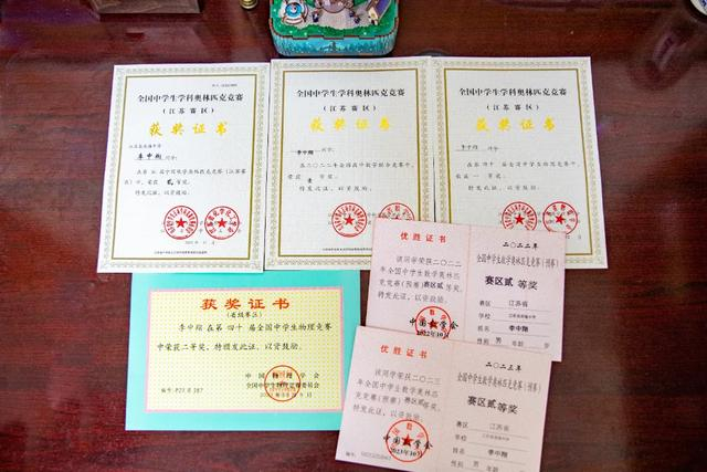 走进李中翔的卧室,一切都打理的井井有条,满满两书架的书很是显眼,从各种数理化专业书籍到文史政治读本,涉猎十分广泛。李中翔说,他一直对数理专业十分感兴趣,进入高中之后,取得的奖状和各种竞赛证书铺了满满一大桌子,在数理化全国奥林匹克竞赛和其他全国赛事中拿奖拿到手软。