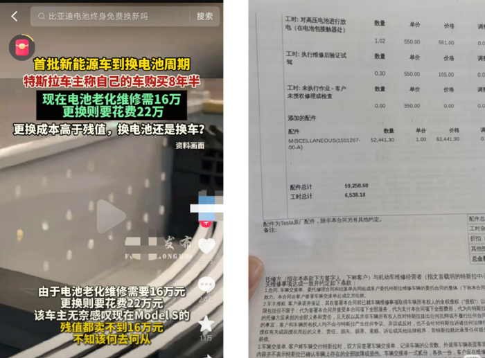 此前有特斯拉Model S车主反馈,8年前花百万购车,如今出保,换电成本达22万元,而当前二手车残值仅剩16万元。