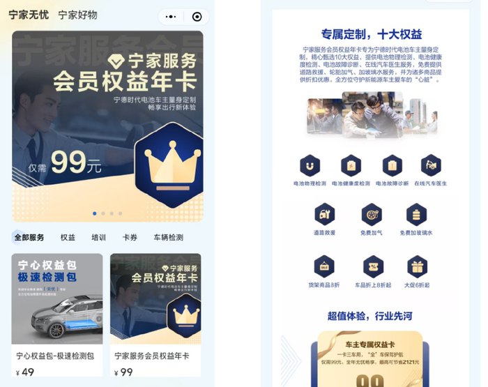 一是宁德时代代表的电池厂商凭借超1200万辆装机量,正从B端供应链向C端服务延伸,推出“宁家服务”加盟品牌,并基于各类检测包、权益卡为门店引入C端流量。