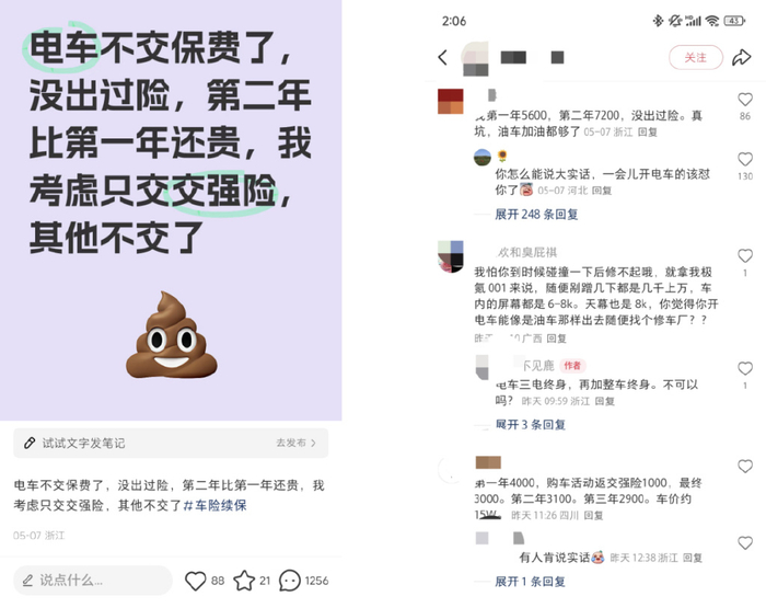 “没出过险,第二年比第一年还贵,我考虑只交交强险,其他不交了”。某新能源车主在社交平台分享道。
