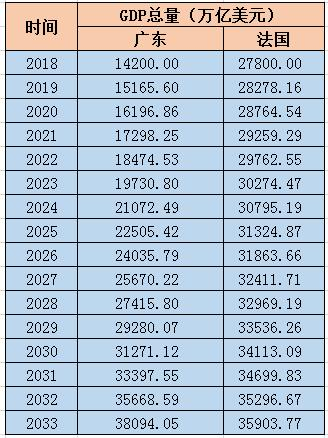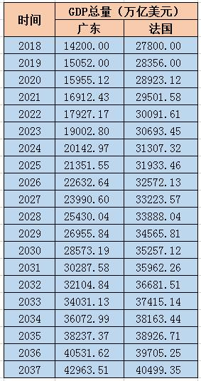 如果按照广东GDP6%的年均增速,法国GDP维持在2%左右的增速来看,广东GDP超过法国也是迟早的事情,按照目前两者的基数以及未来的经济增速推断,到了2036年左右,广东的GDP总量将会超过法国。