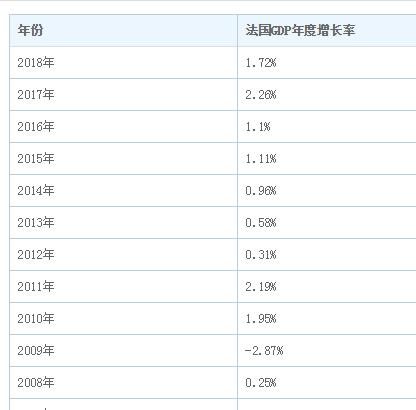 而从2014年到2018年,法国GDP的增速分别是0.96%,,1.11%,,1.1%,,2.26%,1.72%,过去5年法国GDP平均增速是1.43%。