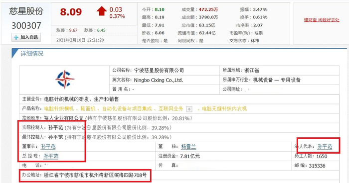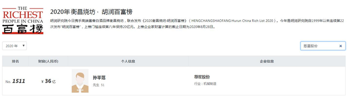 公开资料显示,孙平范,1969年出生,浙江慈溪人,复旦大学EMBA学历。现任宁波慈星股份有限公司实际控制人、董事长兼总经理、法人代表。2020年10月20日,孙平范以36亿元人民币财富位列《2020衡昌烧坊·胡润百富榜》第1511位。
