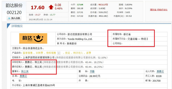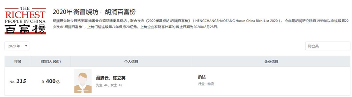 公开资料显示,陈立英, 1975年10月出生,杭州桐庐人,浙江商业职业技术学院商业经营专业毕业,东华大学EMBA。韵达货运董事长聂腾云妻子。现任韵达控股股份有限公司实际控制人、董事长。2020年10月20日,聂腾云、陈立英夫妇以400亿元人民币财富位列《2020衡昌烧坊·胡润百富榜》第115位。