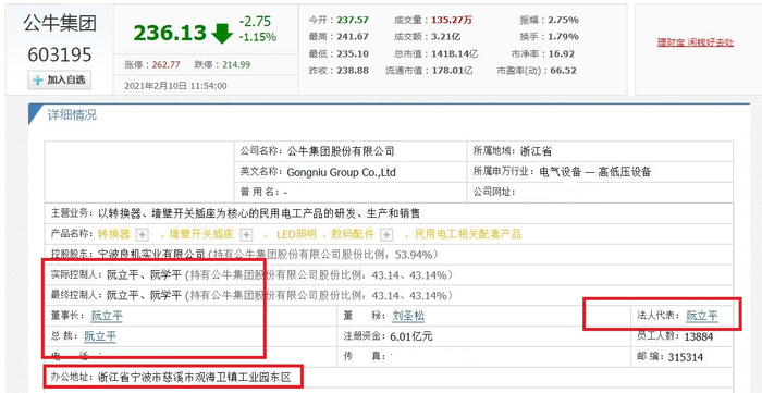 公开资料显示,阮学平,1972年出生,浙江慈溪人,初中学历,拥有新加坡永久居留权、中国香港居民身份证。现任公牛集团股份有限公司实际控制人、副董事长兼董事。2020年10月20日,阮学平以450亿元人民币财富位列《2020衡昌烧坊·胡润百富榜》第96位。