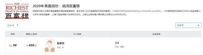 另据最新的《2020衡昌烧坊·胡润百富榜》显示,小编无意中搜索发现,企业所在地在浙江慈溪的亿万富翁,至少有4人榜上有名,即是:公牛集团股份有限公司实际控制人阮学平(450亿元)、阮立平(450亿元);韵达控股股份有限公司实际控制人聂腾云、陈立英夫妇(400亿元);宁波慈星股份有限公司实际控制人孙平范(36亿元)等。此外,亿晶光电科技股份有限公司实际控制人古汉宁也极具代表性。