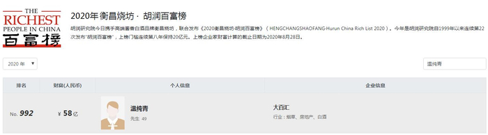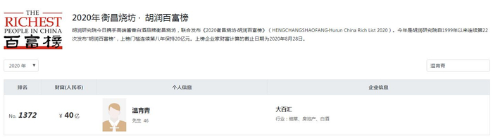 公开资料显示,温育青,1974年10月出生,广东梅州五华人,长江商学院高级工商管理硕士。现任五叶神品牌集团董事长、大百汇集团总裁、厚工坊酒业有限公司董事长、阿里山集团有限公司董事长。2020年10月20日,温育青以40亿元人民币财富位列《2020衡昌烧坊·胡润百富榜》第1372位。