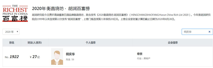 公开资料显示,何庆华,1961 年出生,广东梅州五华人,现任惠州帝景集团董事长。2020年10月20日,何庆华以27亿元人民币财富名列《2020衡昌烧坊胡润百富榜》第1922位。