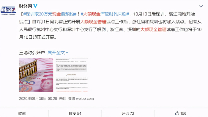 深圳这个地区,从去年十一之后,就开始正式启动大额现金管理试点,这次针对的群体是广泛的,不仅仅是个人还有公司。深圳对公客户大额现金管理金额起点为50万元,那么对私客户的大额现金管理金额起点为20万元。
