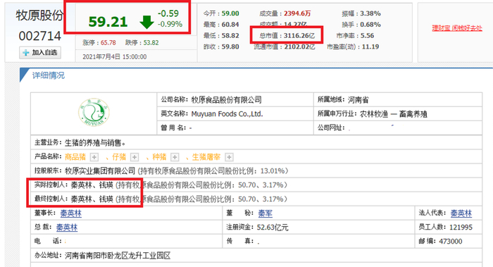 牧原集团始建于1992年,是一家集饲料加工、种猪扩繁、商品猪饲养为一体的大型养殖企业。旗下牧原食品股份有限公司于2014年1月28日在深圳证券交易所挂牌上市,股票代码:002714。位列《2019河南民营企业100强榜》第19位和《2020中国民营企业500强榜》第46位。截止2021年7月4日牧原股份的股票价格59.21元/股,总市值3116.26亿人民币