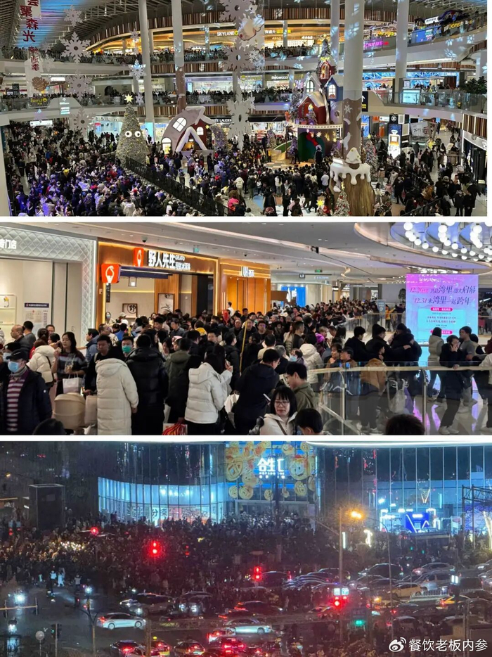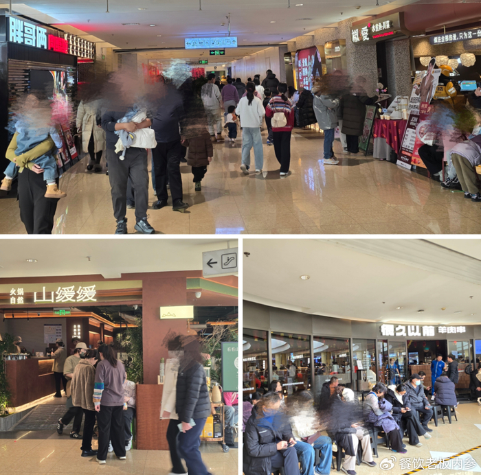 元旦首日,跨年夜氛围不减,各大商圈依旧人从众。中午11点左右,北京华联顺义金街购物中心内多家餐饮门店开始叫号,短时间内门店排位过百桌。B1层美食区人头攒动,几乎寸步难行;4、5高层餐饮门店同样家家爆满。