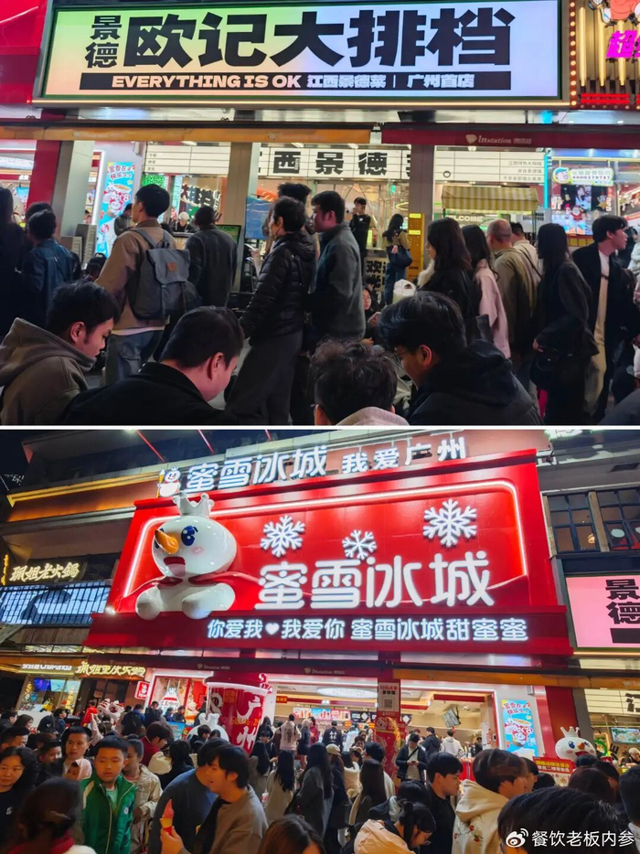 紧邻正佳广场的天河南一路,更是烟火气沸腾。各个火锅店、烧烤店都排着长队。冯校长老火锅的两人位,需要等位182桌,欧记大排档需要等位242桌。同样位于这条街上的蜜雪冰城旗舰店,晚间9点多还要排着长队等候进场。
