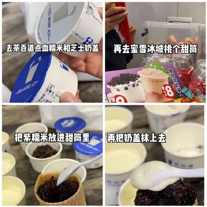 这个起源自河南新乡的“热奶宝”,是由奶油+紫米+甜筒组装的甜品,制作起来也十分很简单。