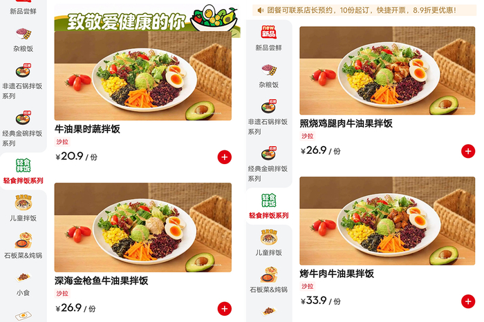 在米村拌饭黄岛吾悦广场店小程序中,可看到新增了“轻食拌饭”类目,目前共有“牛油果时蔬拌饭”“深海金枪鱼牛油果拌饭”“照烧鸡腿肉牛油果拌饭”以及“烤牛肉牛油果拌饭”4款产品,标签均为“沙拉”。