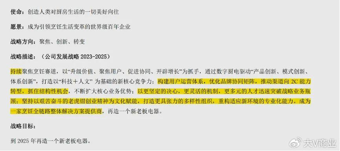 2023年,老板电器将发展战略从“专注烹饪,聚焦吸油烟机,扩大第一品类优势、领先第二品类,稳步推进第三品类”,进一步更改为“聚焦烹饪赛道,持续扩大核心业务优势,迅速突破战略业务瓶颈,构建以“科技+人文”为基础的核心竞争力”,并且要实现“到2025年再造一个新老板电器”。