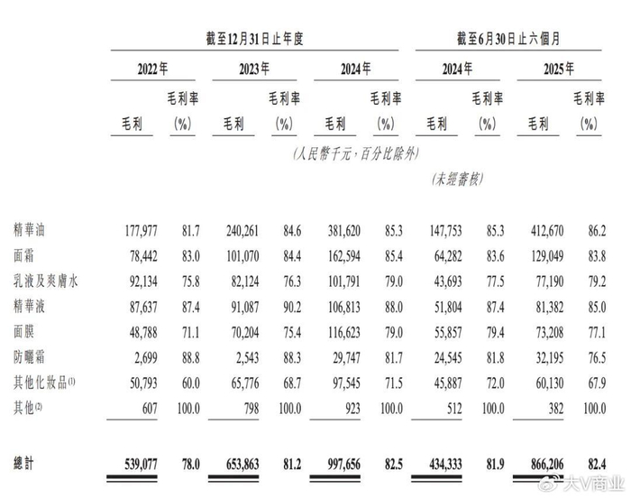 招股书显示,2025年上半年林清轩的整体毛利率高达82.4%。其中,核心大单品“山茶花精华油”更是“利润收割机”,其毛利率从2022年的81.7%一路飙升至2025年上半年的86.2%,位居所有品类之首,面霜等产品的毛利率也普遍维持在83%以上。