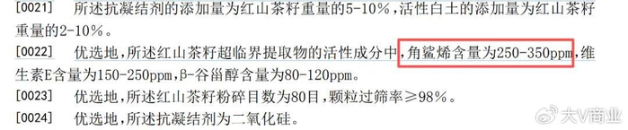 但是,当我们翻看林清轩的山茶花提取物制作、应用于精华油产品等核心专利,我们发现核心成分角鲨烯、维生素E、β-谷甾醇三大核心成分,在核心原料山茶花提取物中含量并不高。