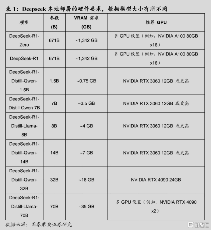 PC是承载更大规模本地模型的首选终端,AIPC换机需求涌现。AIPC硬件产品推出已有时日,但是过去预训练大模型能力有限以及基于国外厂商API调用的限制,导致用户换机动力不足。近期Deepseek开源模型的硬件适配成本更低且推理表现优异。蒸馏后的模型可以通过AnythingLLM和Ollama等实现PC本地部署,不仅保护数据隐私而且可以根据需求进行定制优化。蒸馏后的模型参数涵盖1.5B/7B/8B/14B/32B/70B,根据测评表现,参数规模在32B及以上的模型具有显著更好的性能。相较于其他终端,PC具备生产力工具属性,用户更加追求性能体验,是承载更大规模本地模型的首选终端。本地部署对PC硬件提出了较高要求,尤其是32B及以上参数规模的模型,需要24GB及以上的GPU配置,以及更大的内存、更高的散热/电磁屏蔽等要求。伴随着更高规格的本地模型部署需求爆发,AIPC换机将成为必然趋势。