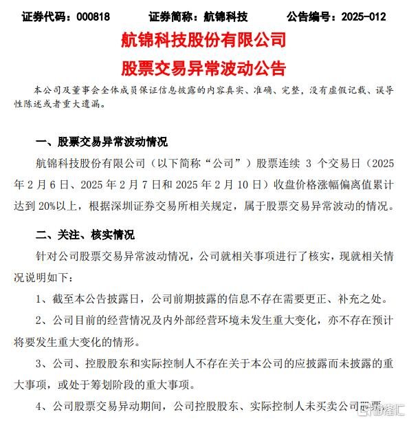 在股价经历了一波大涨后,航锦科技已经连续发布了两次股票异动公告。