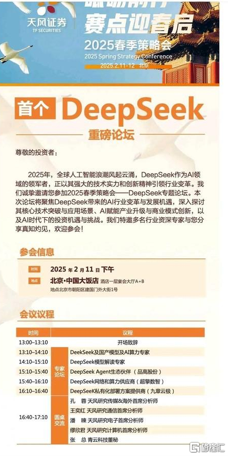 同时,2月11日-2月12日,天风证券将举办2025春季策略会,将于今日下午进行首个DeepSeek专题论坛。
