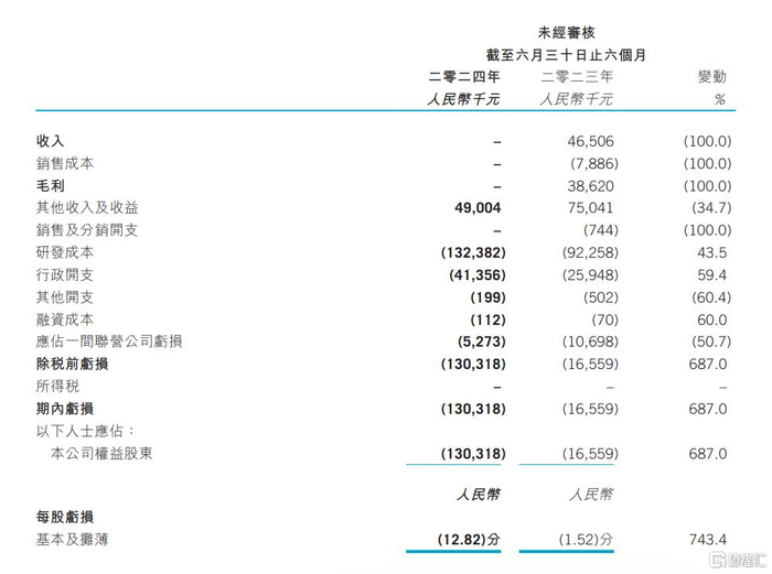 多重因素影响下,歌礼制药2024年上半年收入为0;期内亏损增加687%至1.30亿元,主要由于研发成本的增加;期内研发成本约1.32亿元,同比增长43.5%。