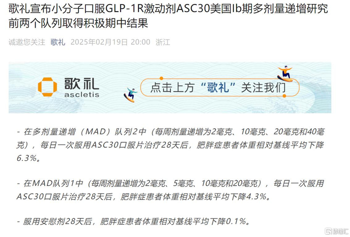 昨日,歌礼制药宣布,小分子口服GLP-1R激动剂ASC30在美国的Ib期多剂量递增研究取得积极期中结果。