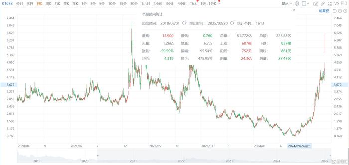随后,公司股价就一路下行,期间虽有几个小反弹,最低时一度触及0.76港元/股,近乎“归零”,较历史高点暴跌95%。