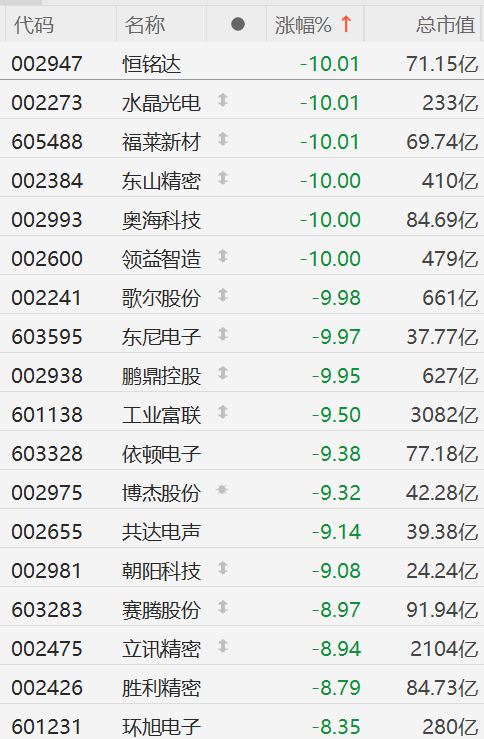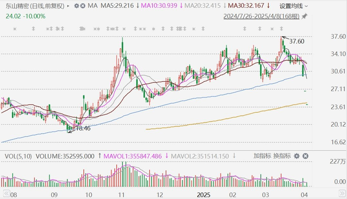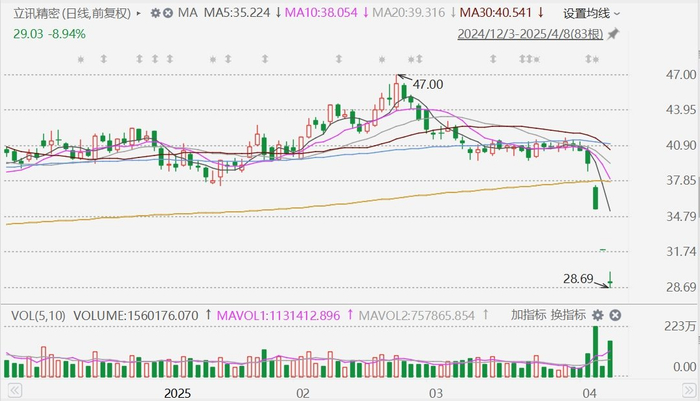 延续近日跌势,苹果概念股今日再度大面积跌停,其中,恒铭达、水晶光电、福莱新材、东山精密、奥海科技、领益智造、东尼电子、鹏鼎控股等跌停。恒铭达、东山精密、水晶光电连续3日跌停,立讯精密3日累跌27%创1年新低。隔夜美股市场苹果收跌3.67%,为连续第三日下跌,三日累跌22%。专注苹果的科技记者马克・古尔曼发文认为,在美国当局最新关税政策下,苹果公司仍然不会在这几年内将iPhone手机生产转移到美国本土,主要是因为成本太高。古尔曼还认为,苹果公司会与其供应链进行谈判,让这些供应链公司给予苹果更低的定价;或进一步调整供应链,将组件供应商/产品组装商分散到全球各地来应对关税挑战,以便苹果公司在美国当局最新关税政策下仍可以保证利润率。