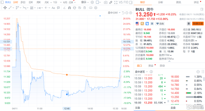 格隆汇获悉,4月11日,Webull Corporation(微牛公司)通过SPAC(特殊目的收购公司)SK Growth Opportunities Corporation成功登陆纳斯达克,股票代码为 “BULL”。截至上市首日收盘,微牛公司股价涨超10%至每股13.25美元,总市值约60.87亿美元。
