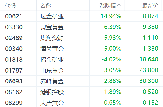 金价冲高回落盘中跳水,盘初全线上涨的港股市场黄金股集体回调。其中,坛金矿业跌近15%,灵宝黄金跌超6%,潼关黄金跌5%,招金矿业跌4%,山东黄金跌3%,赤峰黄金跌近3%。