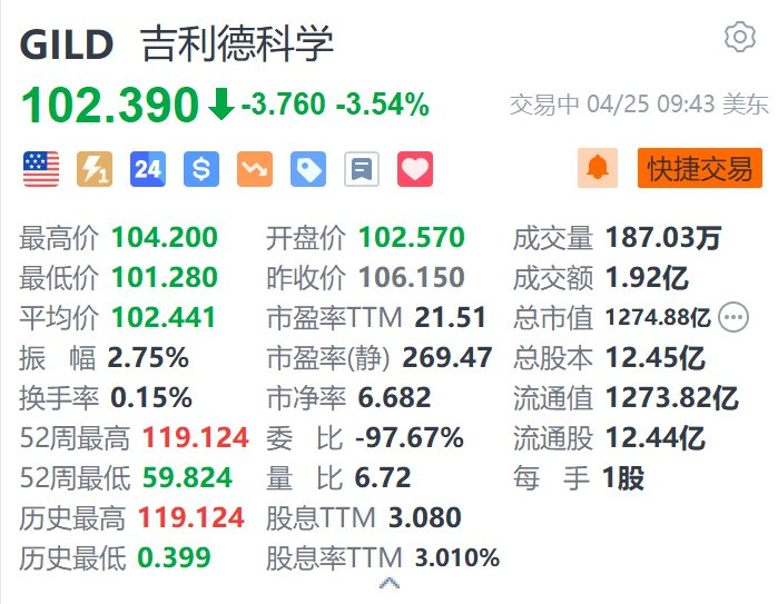 美国药厂吉利德科学(GILD.US)跌超3.5%,报102.39美元。消息面上,吉利德科学公布,第一季度营收同比跌不足1%至67亿美元,市场预期为68亿美元;调整后每股盈利1.81美元,市场预期为1.79美元。市场关注公司的爱滋病预防疫苗lenacapavir审批情况,美国食品及药物管理局料于6月19日决定是否批准该款每年注射两次的药物作为爱滋病疫苗。公司称目前未听到影响该药推出的消息。(格隆汇)