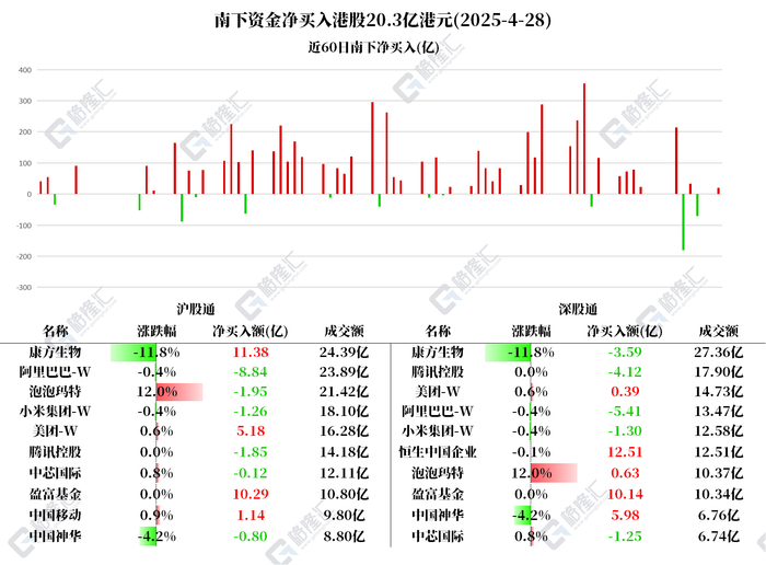 净买入盈富基金20.43亿、恒生中国企业12.51亿、康方生物7.79亿、美团-W 5.56亿、中国神华5.17亿、中国移动1.13亿;