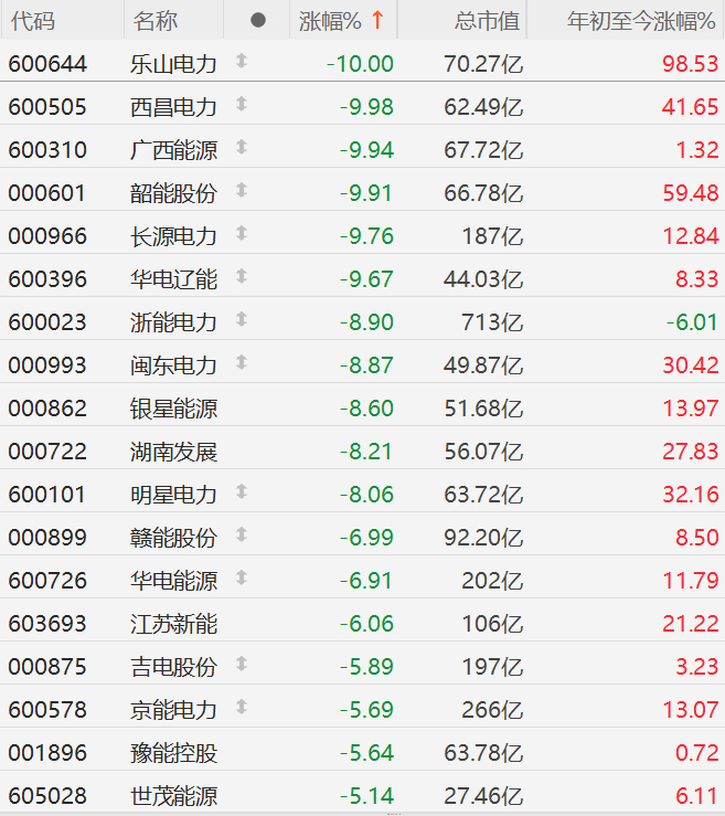 格隆汇4月29日|此前连续多日走强的电力股今日集体下挫。其中,乐山电力、西昌电力、广西能源跌停,韶能股份、华电辽能、长源电力逼近跌停,闽东电力、浙能电力、银星能源、湖南发展、明星电力跌超8%,赣能股份、华电能源、江苏新能跌超6%,吉电股份、京能电力、豫能控股、世茂能源跌超5%。
