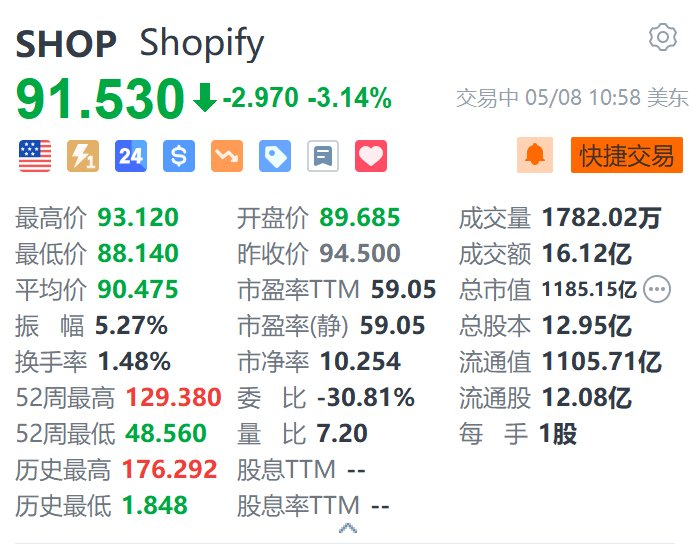 加拿大电商平台Shopify(SHOP.US)跌3.14%,报91.53美元。消息面上,Shopify第一季净亏损从去年同期的2.7亿美元扩大至6.8亿美元,每股亏损0.53美元,而市场预期录得每股盈利0.17美元;营收同比增27%至23.6亿美元,超过预期的23.3亿美元。(格隆汇)