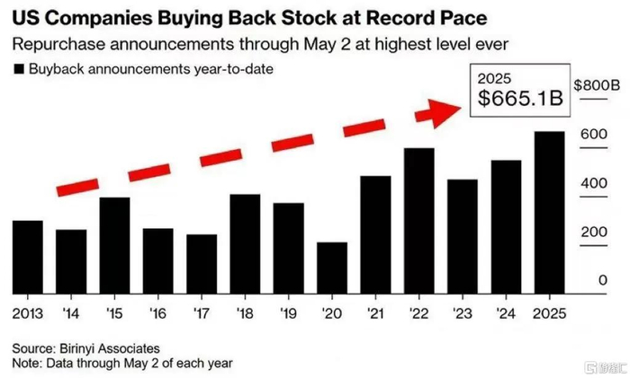 年初至今,美股回购公告已达到创纪录的6651亿美元,已超过了2022年创下的5985亿美元的前高点。