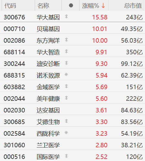 格隆汇5月13日|A股市场基因检测概念股走强,其中,华大基因涨超15%,贝瑞基因拉升涨停、东方海洋此前涨停,迪安诊断、华大智造、金域医学、美年健康、达安基因、东方生物等跟涨。
