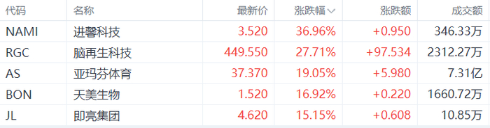 中概股收盘涨幅前五的个股为:进馨科技涨36.96%,脑再生科技涨27.71%,亚玛芬体育涨19.05%,天美生物涨16.92%,即亮集团涨15.15%。(格隆汇)