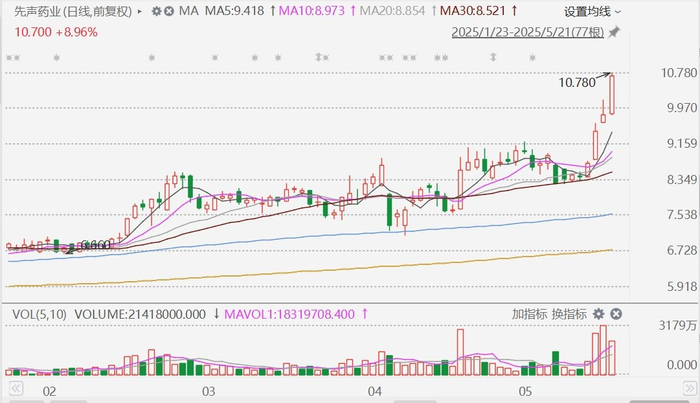 格隆汇5月21日|延续近日强势,先声药业(2096.HK)今日再度走强,盘中拉升涨近10%,报10.78港元,为连续第四日上涨,股价创2023年2月以来新高。近期部分国家和地区新冠疫情呈小幅上升趋势。先声药业近日表示,近期公司抗新冠创新药先诺欣的同比和环比销量数据均显著上涨。其中,4月初销量增长主要来自上海、浙江、北京、江苏等地区;5月初广东地区的销量也开始上升;5月以来整体销售大幅度增长。