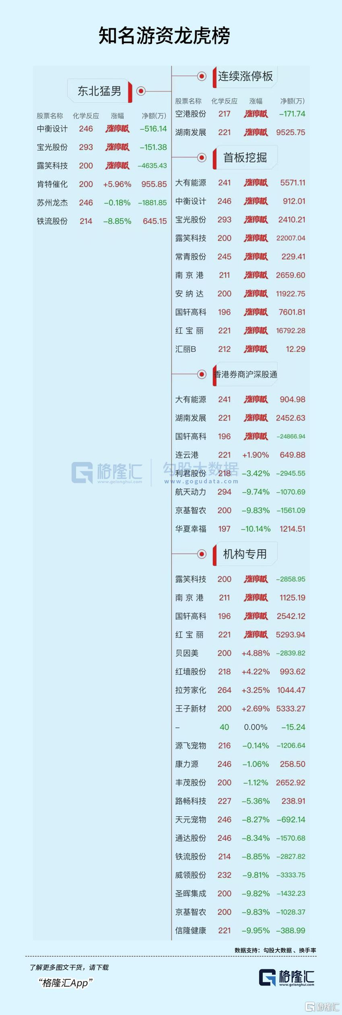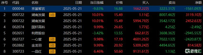 龙虎榜中,涉及深股通专用席位的个股有4只,净卖出国轩高科2.49亿元、利君股份2945.55万元、京基智农1561.09万元。