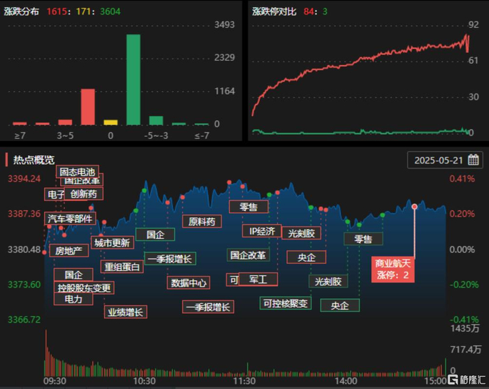 5月21日,主要指数小幅收涨,个股跌多涨少,3604只个股下跌,1615只个股上涨,84只个股涨停,3只个股跌停。