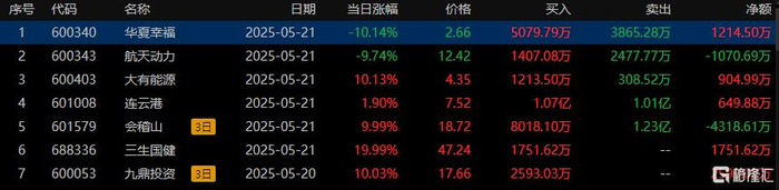 龙虎榜中,涉及沪股通专用席位的个股有5只,净买入三生国健1751.62万元、华夏幸福1214.5万元,净卖出航天动力1070.69万元。