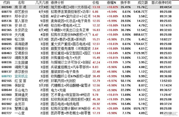 高位股方面,并购重组概念综艺股份6天5板、天汽模4连板、湖南发展、空港股份、宜宾纸业3连板、慧博云通、信邦智能2连板,港股口股南京港7天6板,美妆丽人丽妆5连板,化工股安纳达6天4板,红宝丽4天2板,固态电池滨海能源3连板、金龙羽2连板,医药零售一心堂2连板。