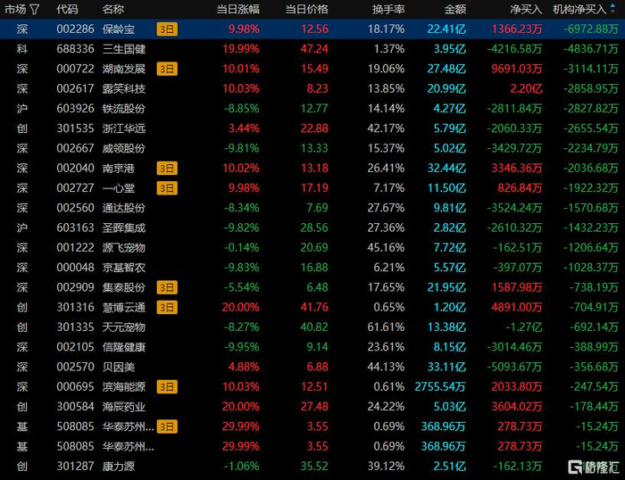 龙虎榜中涉及机构专用席位的个股中,单日净卖出额前三为三生国健、露笑科技、铁流股份,分别为4836.71万元、2858.95万元、2827.82万元。
