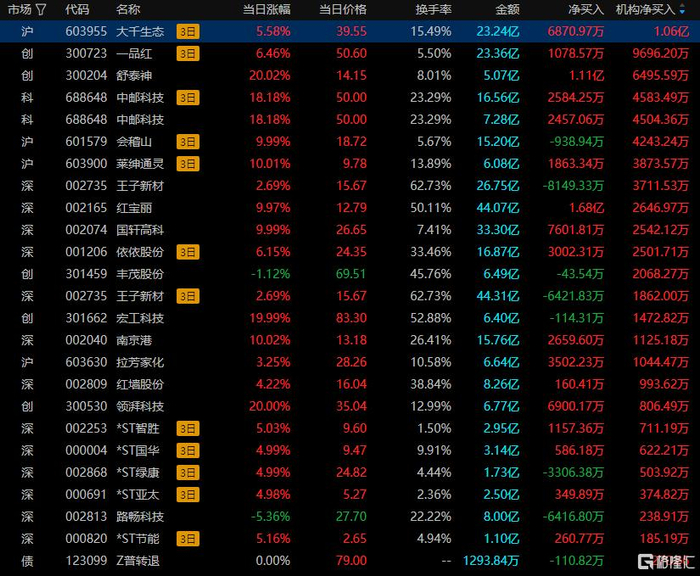 龙虎榜中涉及机构专用席位的个股中,当日净买入额前三为舒泰神、中邮科技、王子新材,分别为6495.59万元、4504.36万元、3711.53万元。