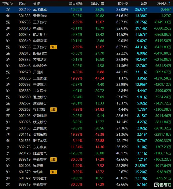 成飞集成跌停,成交额35.57亿元,换手率25.08%。T王净买入5791万元。